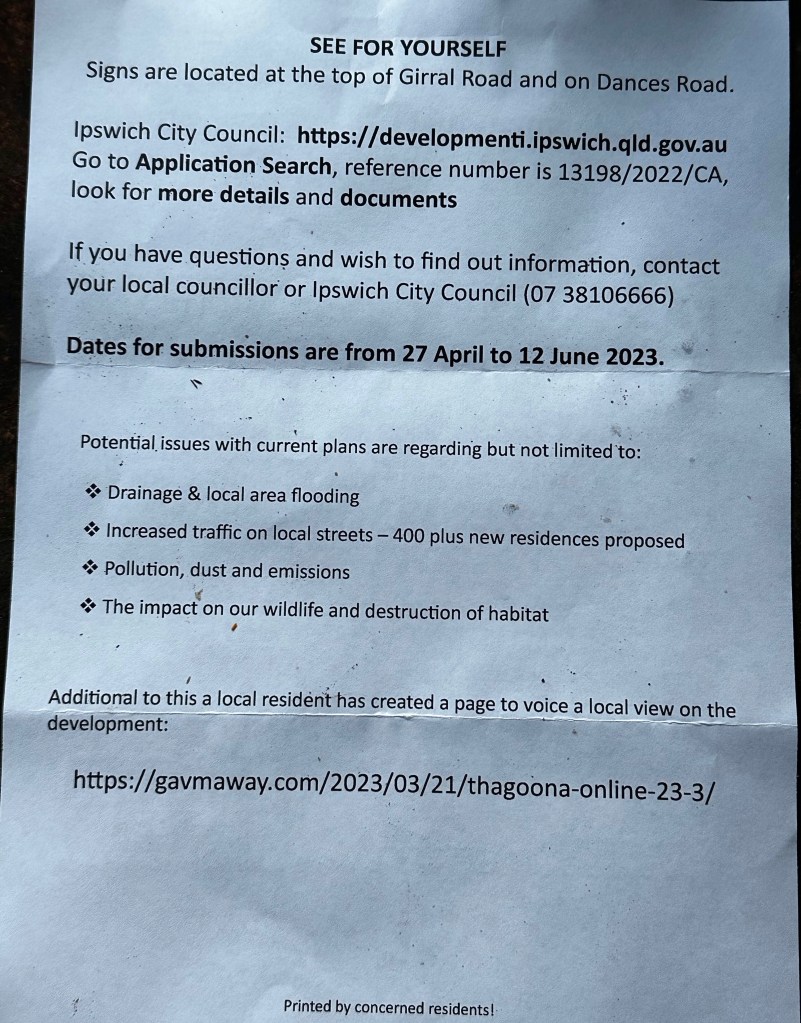 Thank you all for your interest in this project at the top of Girral Road, and although we closer to the actual site have our issues, the residents of lower Thagoona will have its own issues that will impact we believe on increase in flooding.