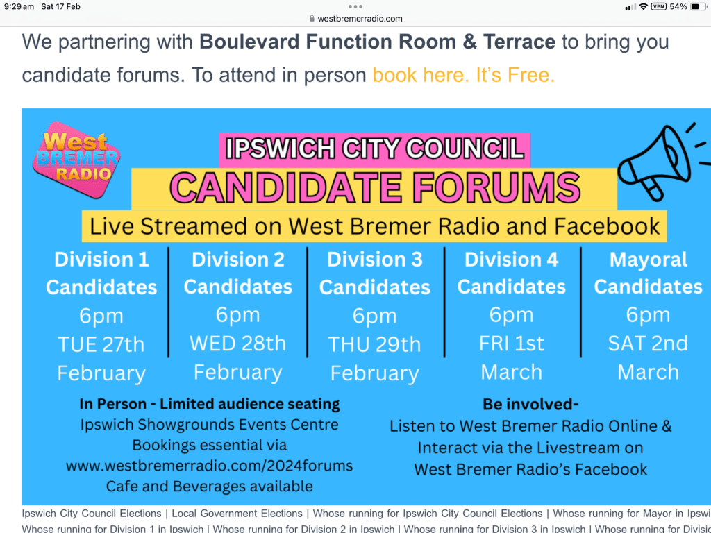 Listen to your Candidates or front up at the Ipswich Showgrounds, see below for info